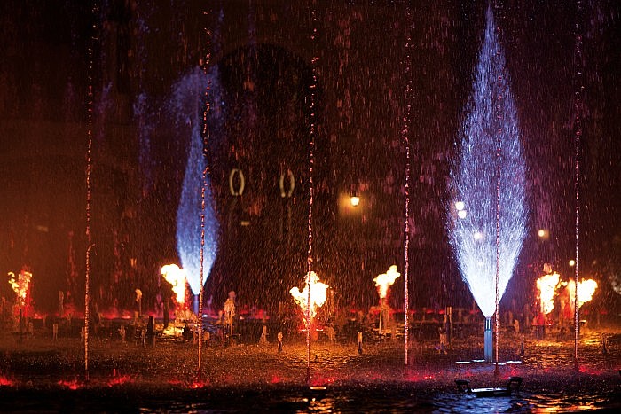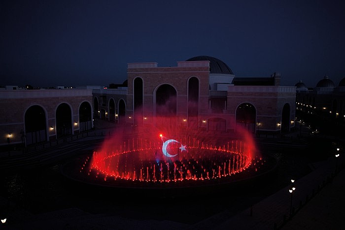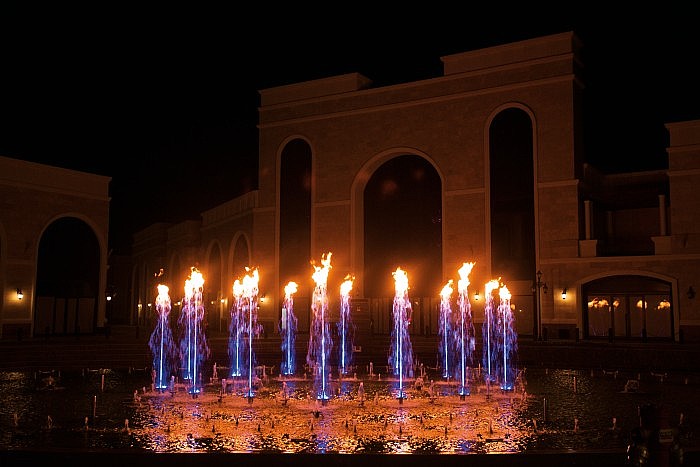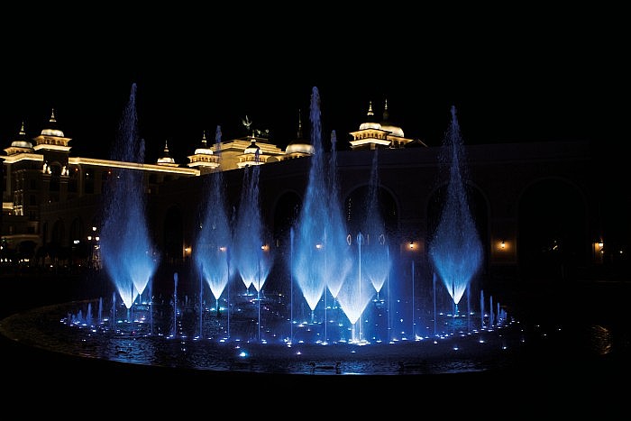 מזרקת מולטימדיה חיצונית בתוך שטח מלון Rixos, אנטליה שבטורקיה, "ארץ האגדות" מוקף במרכזי קניות.